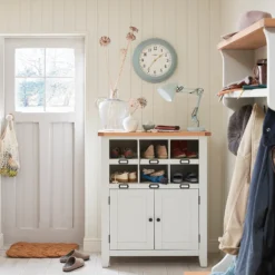 Effortlessly stylish. When we designed this collection, we channelled the look of a charming cottage in the Cotswolds. We’ve taken that farmhouse style and modernised it. Say hello to our Ashstead range. Hang your coat, hide your shoes and perch your hat at this stunning two-tone hallway storage unit. The slimline design makes it ideal for hallways and boot rooms, giving you a tidy entranceway or clutter-free space. The stand-out feature of this unit has got to be the solid oak crates. They offer a wonderful contrast to the painted frames and give you a quaint way to store your belongings.