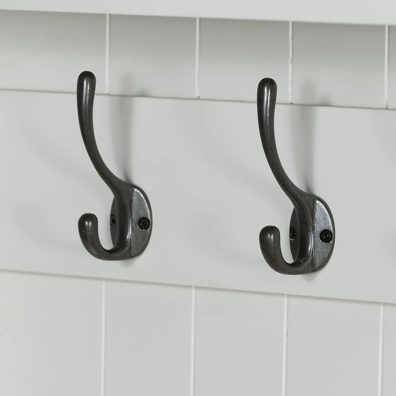 Features coat hooks and an open shelf